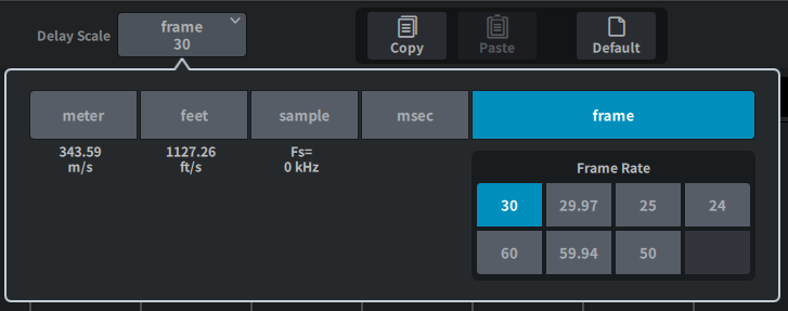 a | Всплывающее окно DELAY SCALE (Шкала задержки) Нажмите эту кнопку, чтобы открыть всплывающее окно DELAY SCALE, в котором можно установить единицу измерения времени задержки.