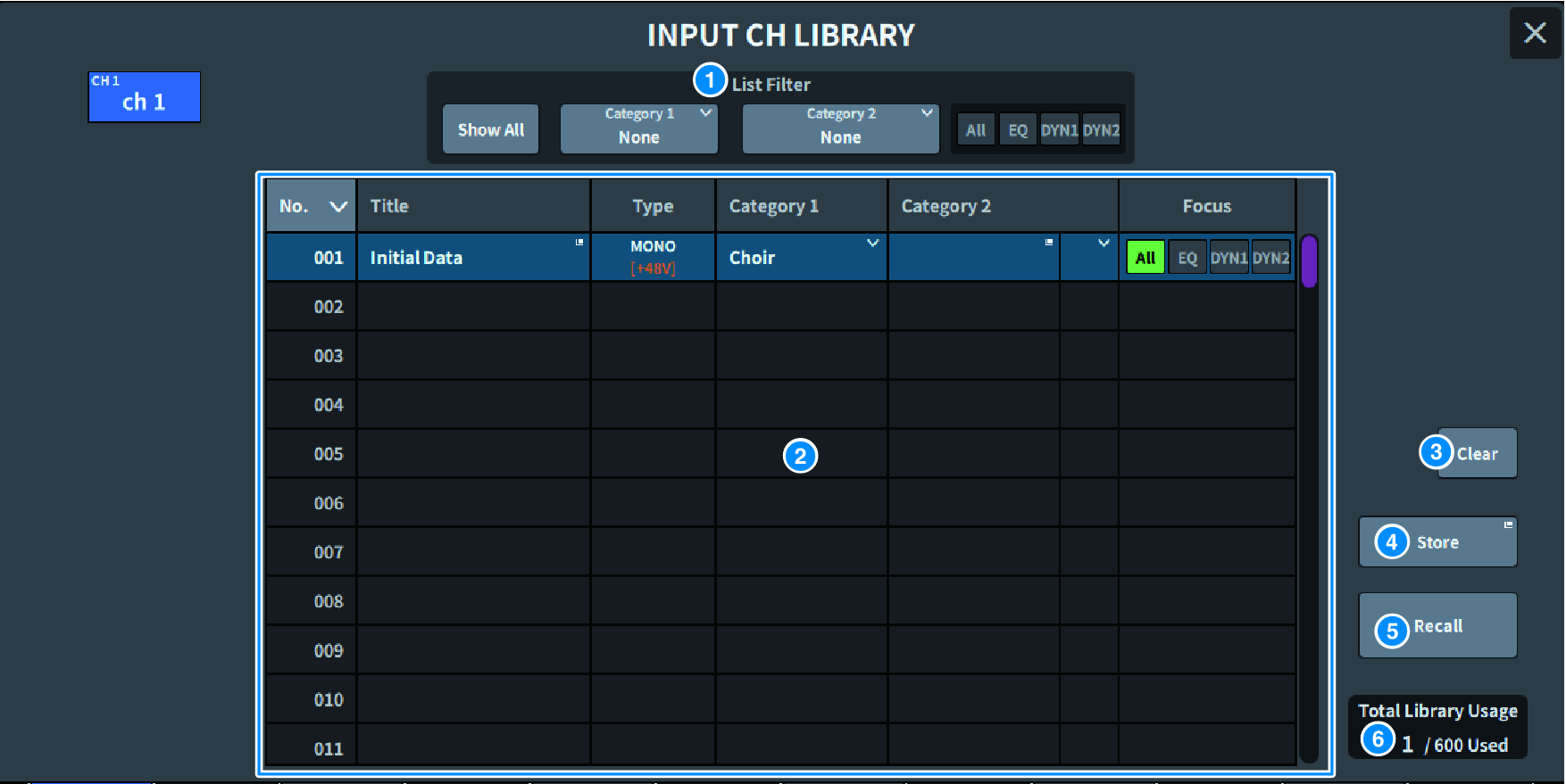 使用库可以存储和调出当前所选通道的EQ或动态设置。