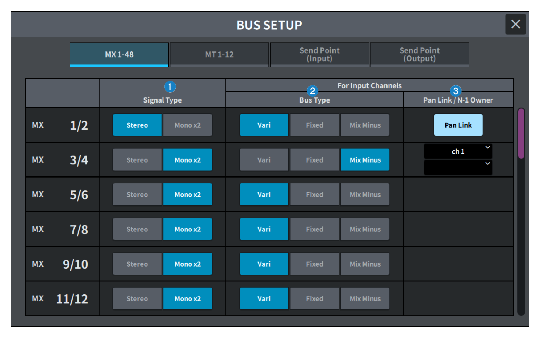 更改基本总线设置(立体声/单声道切换、Pan Link等)。
